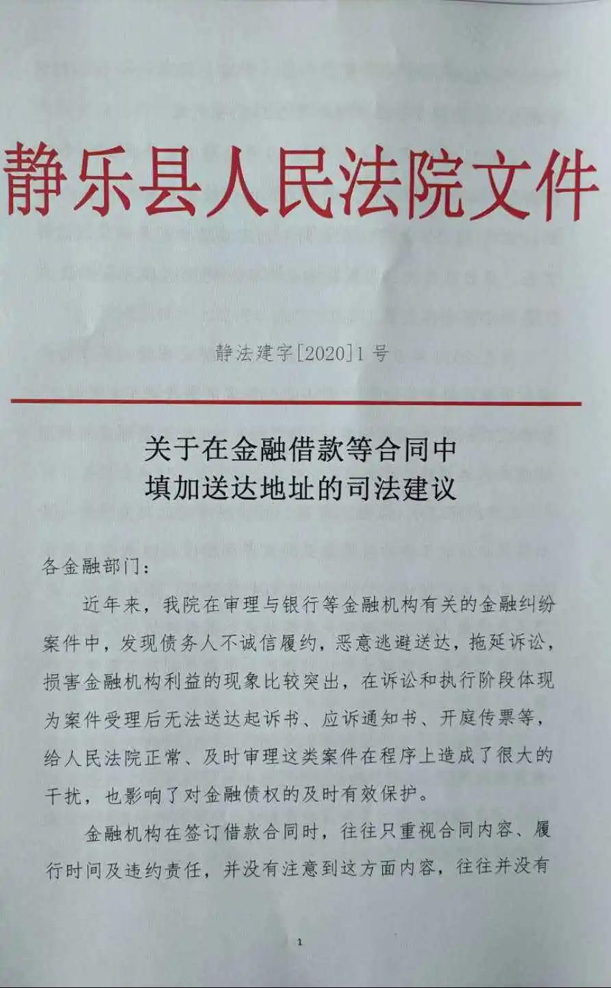 為進(jìn)一步提高金融借款合同糾紛案件法律文書直接送達(dá)、郵寄送達(dá)的成功率,破解送達(dá)難題,縮短金融借款合同糾紛案件的審理周期,有效防范和化解金融機(jī)構(gòu)經(jīng)營風(fēng)險(xiǎn),靜樂法院在多次深入金融部門進(jìn)行調(diào)研的基礎(chǔ)上,結(jié)合相關(guān)法律規(guī)定,經(jīng)審判委員會討論,決定向金融部門送達(dá)《關(guān)于有效維護(hù)金融債權(quán)解決“送達(dá)難”在合同中約定送達(dá)地址的司法建議》。建議銀行、金融機(jī)構(gòu)在簽訂合同時(shí)制作規(guī)范化、模板化合同條款,提出以合同中約定送達(dá)地址并明確法律責(zé)任的方式,解決非訴階段、仲裁、訴訟等程序中的“送達(dá)難”問題,從而在當(dāng)前經(jīng)濟(jì)形勢下有效維護(hù)金融債權(quán),促進(jìn)合同當(dāng)事人履行誠信義務(wù)。