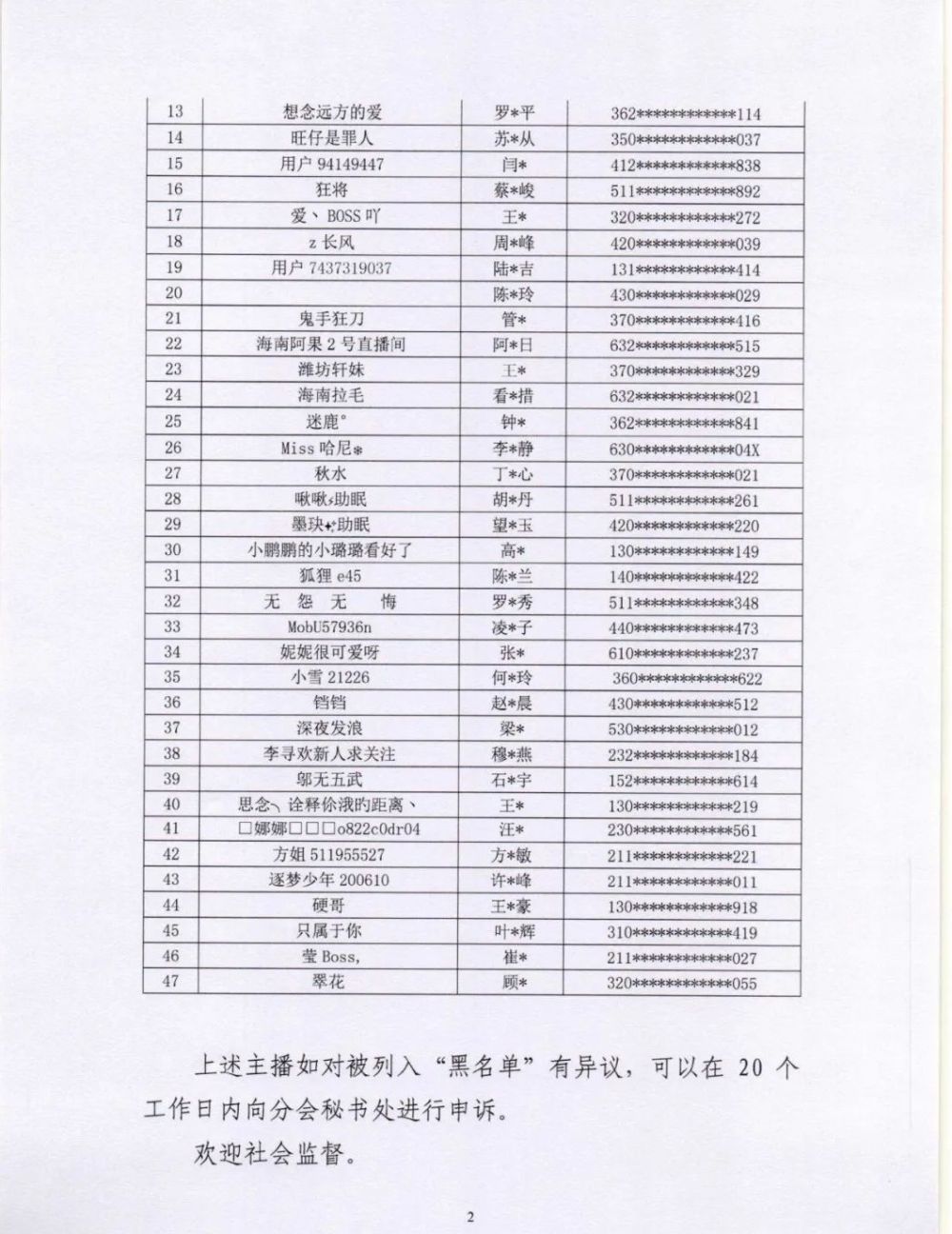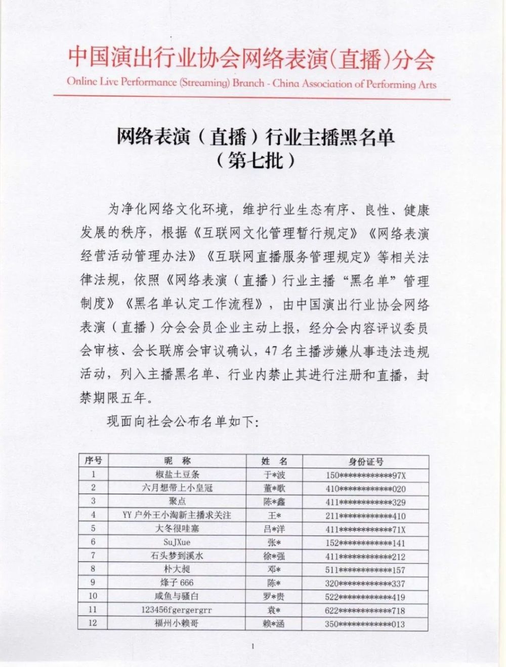 中國演出行業(yè)協(xié)會(huì)網(wǎng)絡(luò)表演(直播)分會(huì)向社會(huì)公布第七批主播黑名單,47名主播涉嫌從事違法違規(guī)活動(dòng),列入主播黑名單。