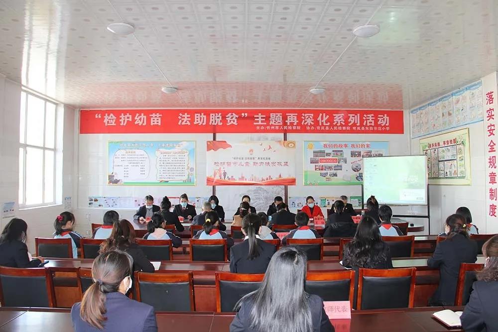 為深入貫徹習(xí)近平總書(shū)記關(guān)于“法治教育從娃娃抓起的重要指示精神”,根據(jù)省院要求,要在集中連片貧困地區(qū)留守兒童及建檔立卡相對(duì)集中就讀學(xué)校開(kāi)展“檢護(hù)幼苗 法助脫貧”主題再深化系列活動(dòng),充分體現(xiàn)對(duì)特殊未成年人的關(guān)愛(ài),經(jīng)市院領(lǐng)導(dǎo)研究決定,2020年10月22日上午,忻州市人民檢察院會(huì)同岢嵐縣人民檢察院在岢嵐縣留守兒童相對(duì)集中的東街示范小學(xué)舉行“檢護(hù)幼苗 法助脫貧”主題再深化系列活動(dòng)啟動(dòng)儀式及座談會(huì),忻州市人民檢察院第七檢察部主任楊見(jiàn)青、一級(jí)檢察官胡燁、書(shū)記員靳京、岢嵐縣人民檢察院副檢察長(zhǎng)孫建新、未檢負(fù)責(zé)人王瓊、岢嵐縣教育科技局副局長(zhǎng)田波、岢嵐縣團(tuán)委書(shū)記王晶晶、岢嵐縣婦聯(lián)婦幼辦主任趙愛(ài)玲以及該校校領(lǐng)導(dǎo)、留守兒童代表、部分教師代表共一百余人參加此次活動(dòng),活動(dòng)由孫建新副檢察長(zhǎng)主持。