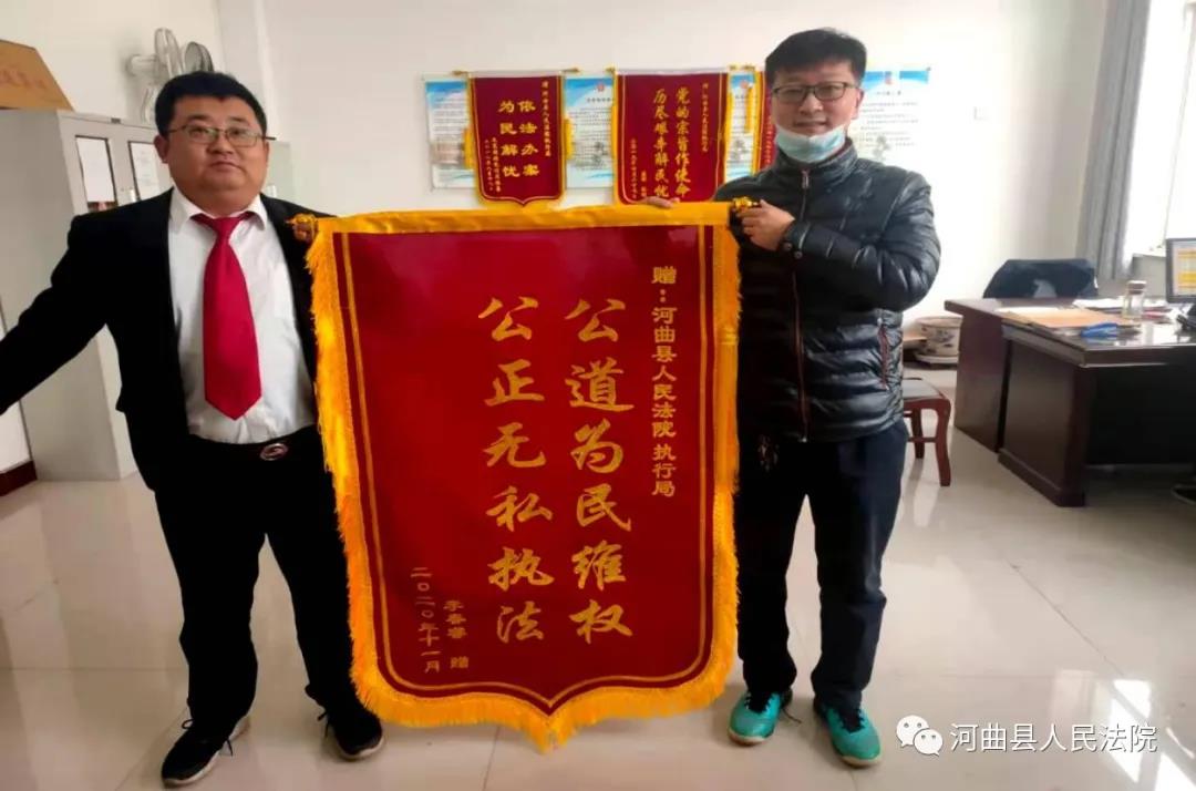 近日,申請(qǐng)執(zhí)行人李某睿來到河曲縣人民法院執(zhí)行局辦公室,將一面繡著 “公道為民維權(quán)、公正無私執(zhí)法 ”的錦旗送至執(zhí)行局局長李淵手中,在遞交時(shí)誠懇地說“謝謝你們?yōu)槲易坊亓私杩?,不知道怎么來感謝你們,現(xiàn)在用這面錦旗表示對(duì)你們的感激和敬意”。