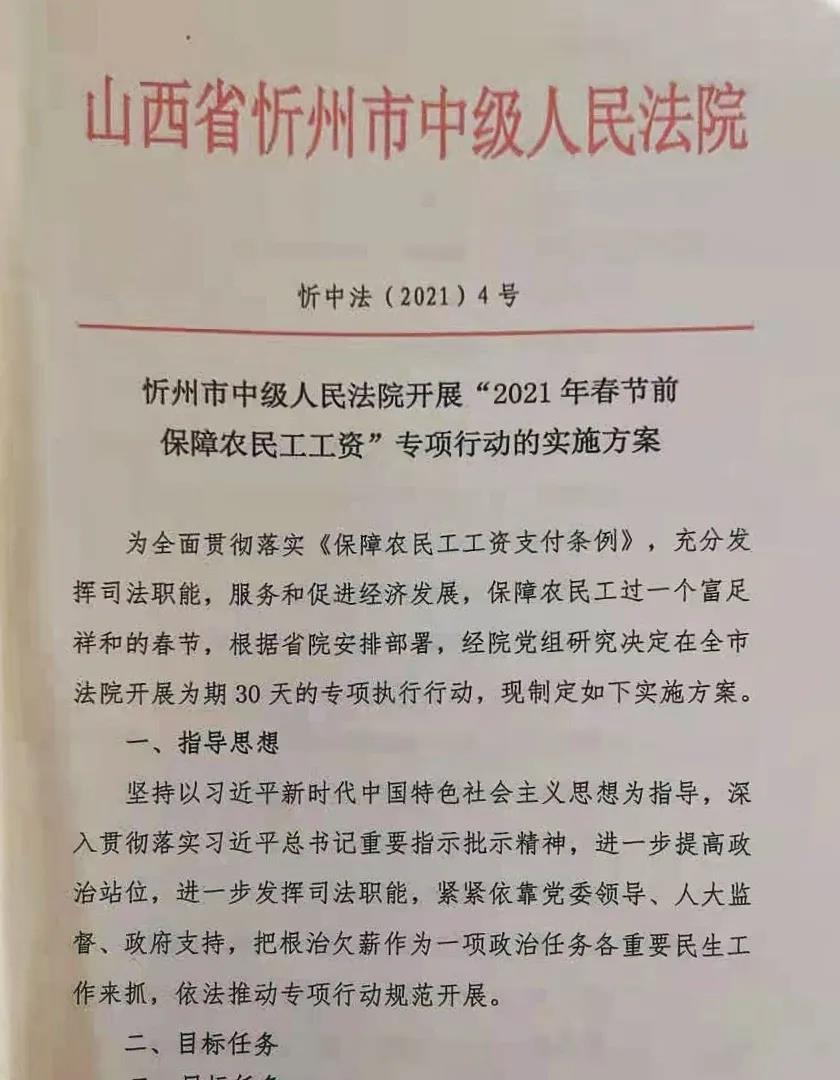 為全面貫徹落實《保障農(nóng)民工工資支付條例》,充分發(fā)揮司法職能,保障農(nóng)民工過一個富足祥和的春節(jié),忻州中院黨組于近期在全市法院范圍開展了為期30天的“2021年春節(jié)前保障農(nóng)民工工資”專項執(zhí)行行動。