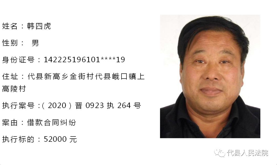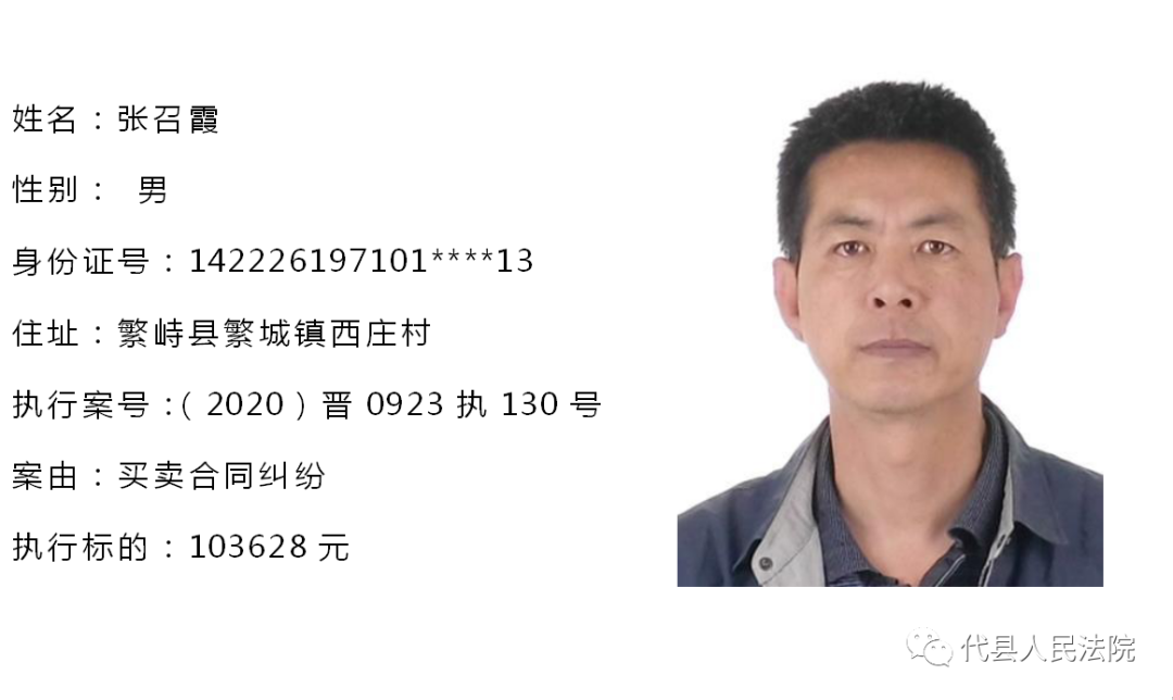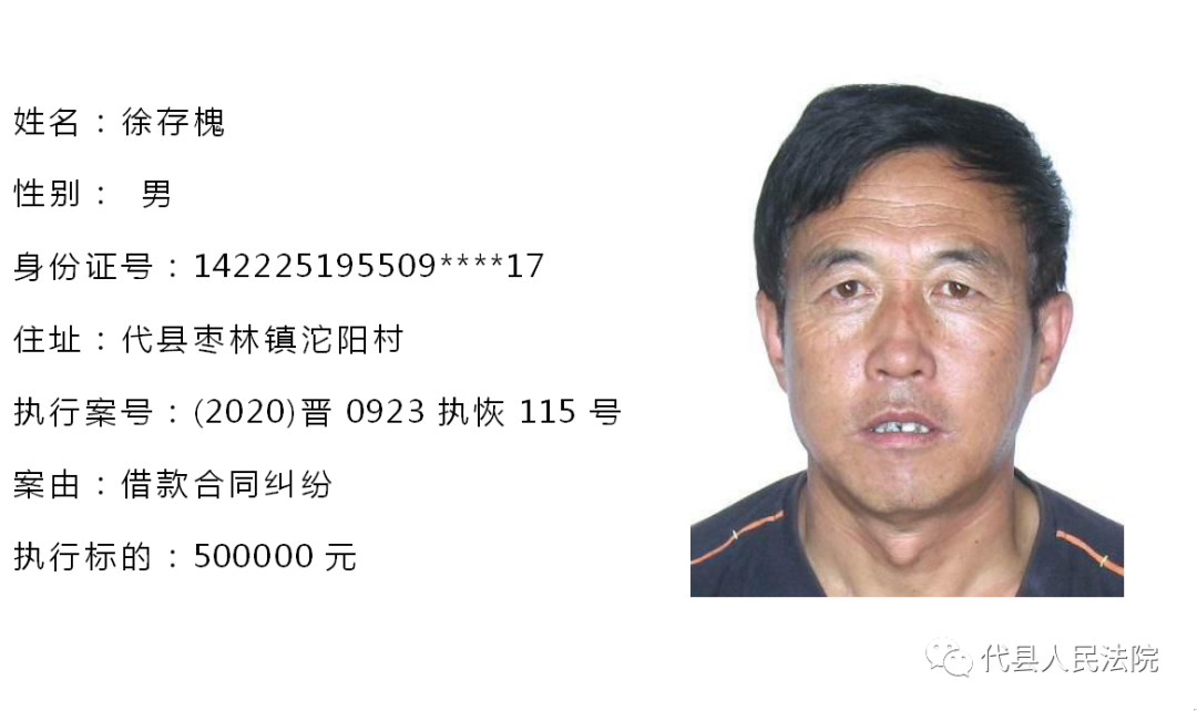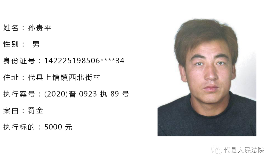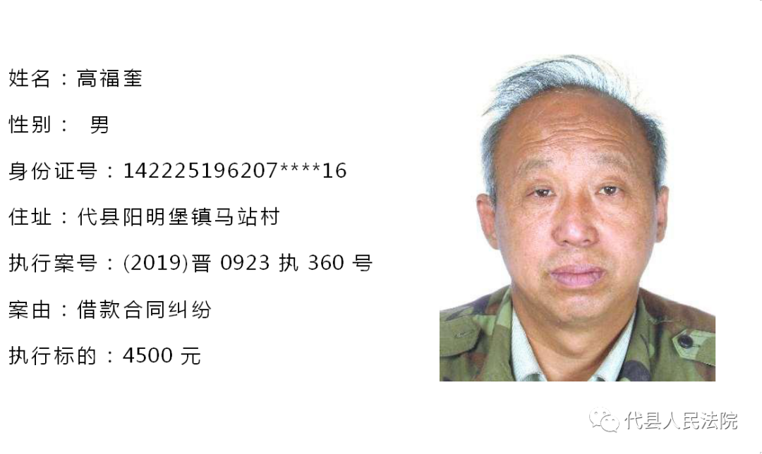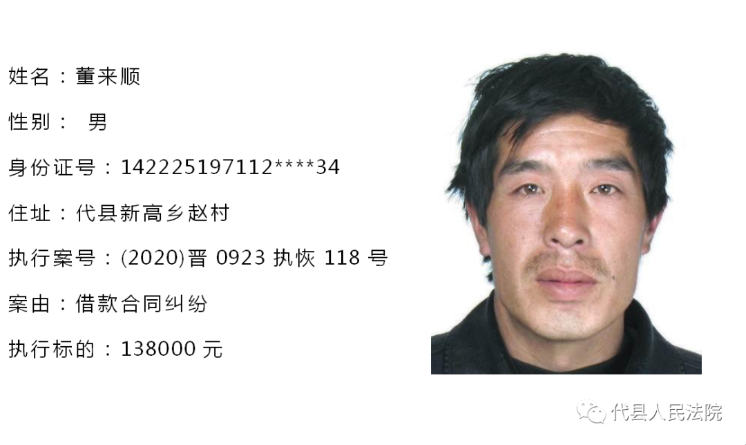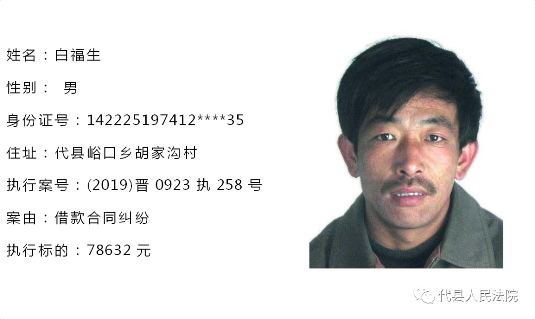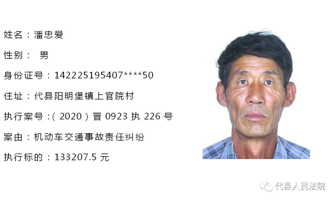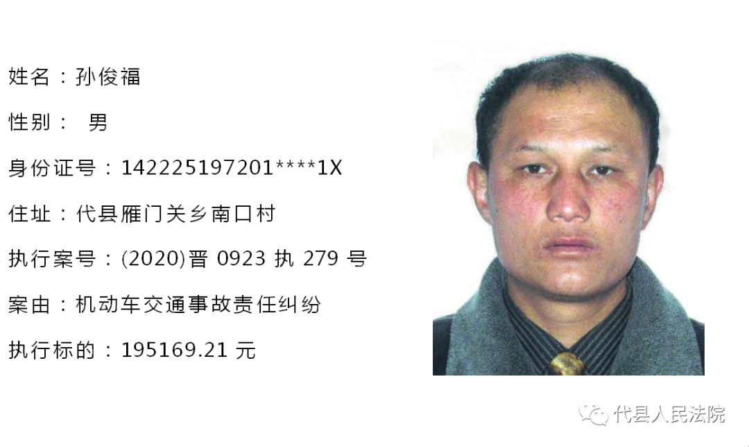 為促使被執(zhí)行人自覺履行生效法律文書確定的義務,推進社會信用體系建設,根據(jù)《中華人民共和國民事訴訟法》第二百五十五條、《最高人民法院關于公布失信被執(zhí)行人名單信息的若干規(guī)定》第七條之規(guī)定,現(xiàn)將代縣法院拒不履行生效法律文書的被執(zhí)行人公布如下,責令其立即向執(zhí)行法院履行義務。對涉嫌拒不執(zhí)行法院判決、裁定犯罪的被執(zhí)行人,將依照《中華人民共和國刑法》第三百一十三條之規(guī)定,嚴肅追究其刑事責任。