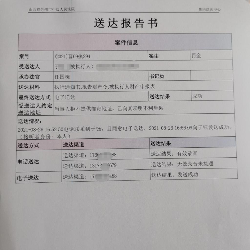 這是忻州中院執(zhí)行的一起罰金案件,執(zhí)行法官窮盡傳統(tǒng)手段一直聯(lián)系不到被執(zhí)行人,通過查控系統(tǒng)只查到被執(zhí)行人名下有少量財產(chǎn)。后通過電子送達平臺迅速聯(lián)系到被執(zhí)行人,被執(zhí)行人賀某某主動與執(zhí)行法官聯(lián)系,因其經(jīng)濟困難,無法一次性繳納全部罰金,先主動繳納5000元罰金,剩余罰金每月分期進行繳納。