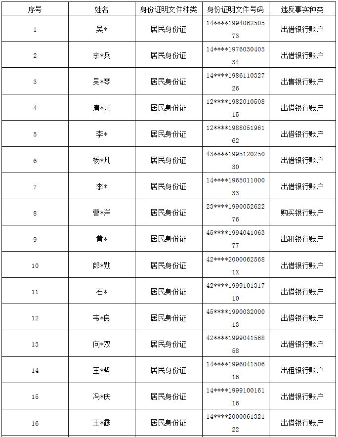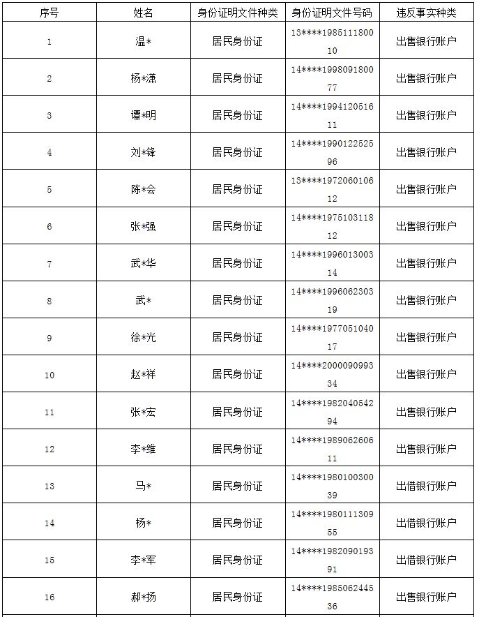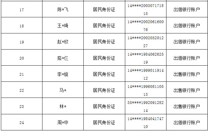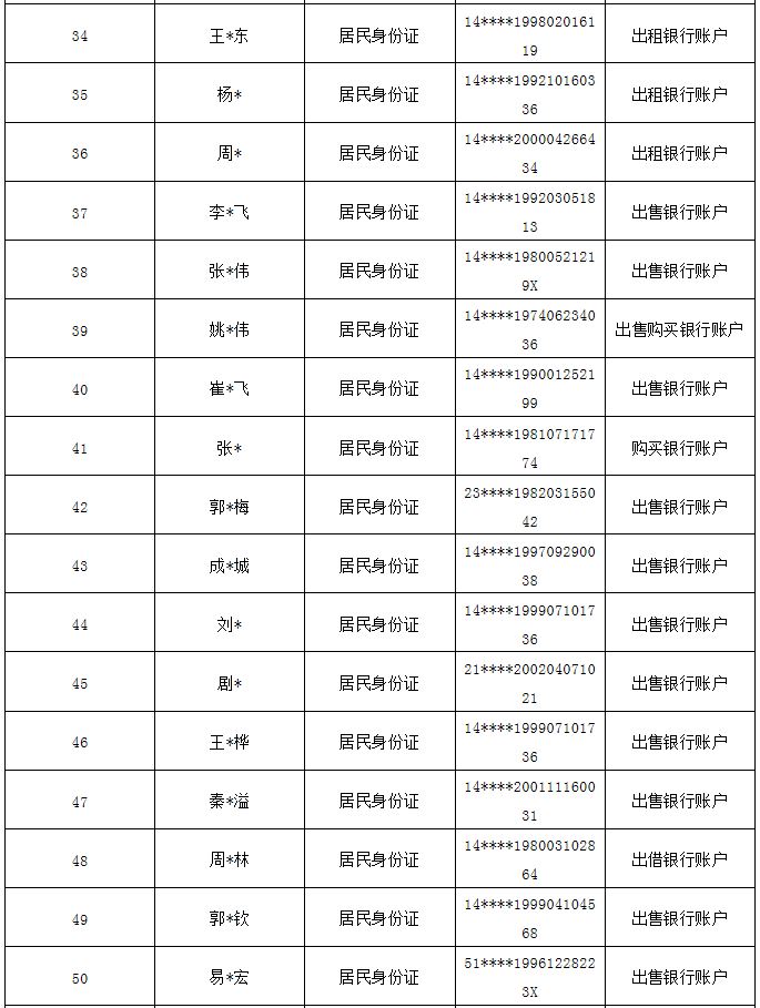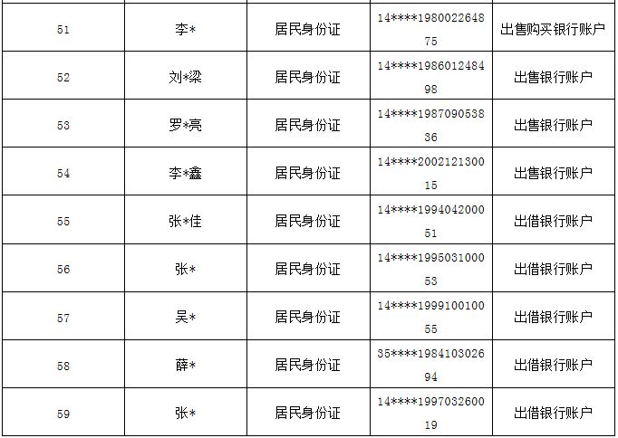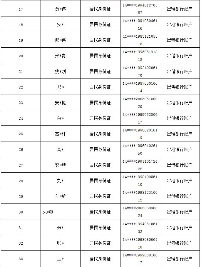 按照公安部“斷卡”專項行動工作部署,忻州市公安局全力以赴推進(jìn)專項行動,嚴(yán)厲打擊整治非法租借、買賣銀行卡和手機(jī)卡等違規(guī)違法犯罪行為,從源頭斬斷“兩卡”的利益鏈條,全力壓縮電信詐騙黑灰產(chǎn)業(yè)生存空間,確實保障人民群眾切身利益,現(xiàn)曝光本市今年以來第五批因非法販賣、出售、出借“兩卡”涉嫌電信網(wǎng)絡(luò)詐騙被懲戒的人員。 一、已被采取刑事強(qiáng)制措施人員