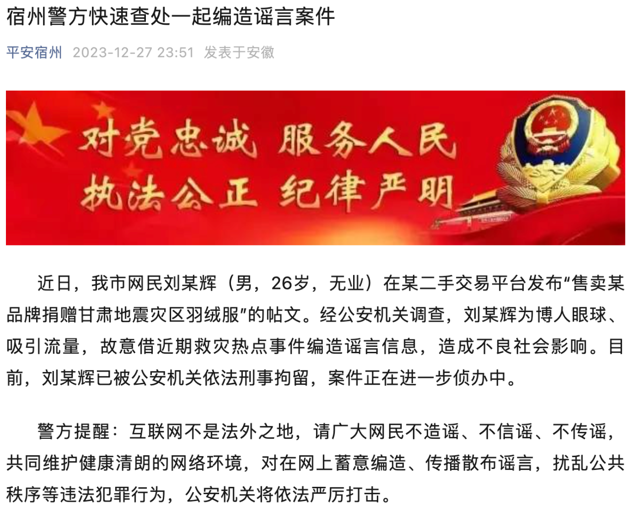 人民網(wǎng)北京12月28日電 (梁秋坪、高清揚)12月27日,安徽省宿州市公安局通報,近日,該市網(wǎng)民劉某輝(男,26歲,無業(yè))在某二手交易平臺發(fā)布“售賣某品牌捐贈甘肅地震災(zāi)區(qū)羽絨服”的帖文。