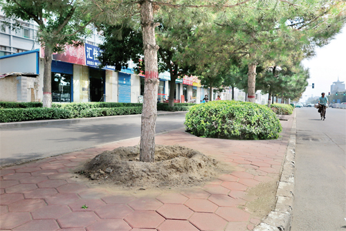 近日,記者途經(jīng)城區(qū)長征西街建設(shè)路口時,發(fā)現(xiàn)在道路北側(cè)的綠化帶內(nèi),有的行道樹樹坑只是用土堆進行了簡單的堆砌,時值秋雨多發(fā)時期,在雨天極易造成一定程度的水土流失。希望市政管理部門能夠引起重視,早日為樹坑穿上一件“金鐘罩”。(王君 攝)