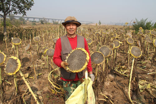 10月13日,原平市解村鄉(xiāng)圪坨村林同種植專(zhuān)業(yè)合作社正在收獲向日葵,該社引進(jìn)三瑞公司種植1000余畝SH363向日葵喜獲豐收。近年來(lái),該市積極引導(dǎo)農(nóng)民調(diào)整農(nóng)業(yè)產(chǎn)業(yè)結(jié)構(gòu),采取“合作社+農(nóng)戶(hù)”的模式,向日葵比玉米收入高四倍,銷(xiāo)售價(jià)每斤4塊左右,合作社為農(nóng)戶(hù)提供種子、種植技術(shù)等服務(wù),帶動(dòng)當(dāng)?shù)厝罕娫鍪罩赂弧?span style="font-family: 楷體,楷體_gb2312, simkai">圖為解村鄉(xiāng)村民趁著秋高氣爽的晴好天氣,在田間地頭葵花籽的情景。(褚震 攝)
