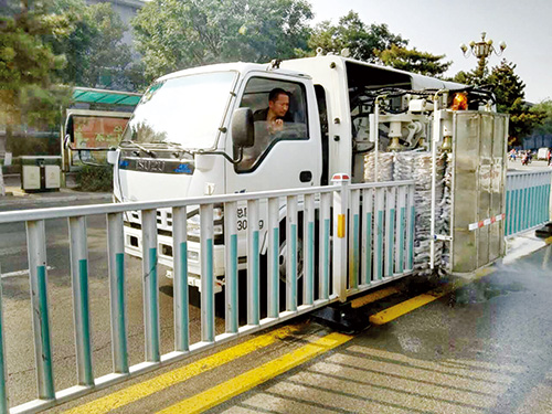 交通護欄可為市民、車輛出行提供安全保障,可人工清洗護欄工作耗時耗力,還存在安全隱患。新購置的護欄清洗車通過伸縮刷子以及車載水箱噴出的水流,完成護欄清洗,工作效率遠遠高于人工清洗,省時又省力,效果還明顯。圖為清洗車正在對城區(qū)交通護欄進行清洗。(張志遠 孫明 攝)