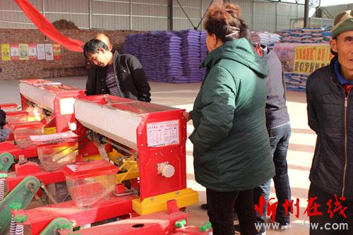 11月17日,來自原平市西鎮(zhèn)鄉(xiāng)的幾位農(nóng)民在聚農(nóng)豐測土配肥中心選擇新型“雙胞胎”播種機(jī),該機(jī)采用一穴雙株,寬窄行種植,畝留苗可比傳統(tǒng)播種機(jī)每畝增加上千株,增產(chǎn)20%以上,成為今后農(nóng)民的首選播種機(jī)。(曹申義 攝)