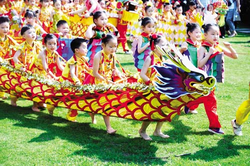 6月14日,孩子們參加旱地龍舟比賽。當(dāng)日,浙江省長興縣中心幼兒園的孩子們身著傳統(tǒng)服飾、掛上香囊,并用紙板、布匹、彩繩制作的旱地龍舟參加“劃龍舟掛香囊”傳統(tǒng)民俗迎端午的活動(dòng),感受中國傳統(tǒng)文化的魅力,了解端午節(jié)的民俗文化。據(jù)新華社 記者 徐昱 攝