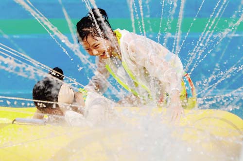 7月16日,孩子們?cè)诮K省淮安市盱眙縣玉皇山水上樂(lè)園戲水消暑。新華社 周海軍 攝