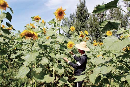 原平市因地制宜,利用坡梁地發(fā)展葵花等小雜糧種植,并創(chuàng)新管護模式有效促進農(nóng)民增收。圖為8月21日原平市解村鄉(xiāng)北崗村農(nóng)民正在對向日葵進行田間管理。(趙春曉 攝)