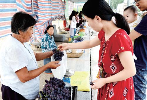 9月9日,河曲縣焦尾城村葡萄交易市場(chǎng),迎來一撥又一撥選購(gòu)葡萄的顧客。該村大力發(fā)展無(wú)公害綠色葡萄項(xiàng)目,所產(chǎn)葡萄酸甜適度,口感極佳,在廣大消費(fèi)者心目中樹立了良好的品牌形象。賈金理 攝