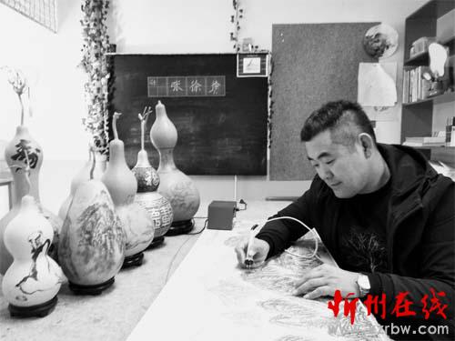 在定襄縣,有一個(gè)叫王燕軍的后生,他的愛好比較獨(dú)特,常手持一把小烙鐵,在葫蘆上熨出烙痕作畫,大家都親切地喊他“葫蘆娃”。王燕軍的這種工藝叫烙畫,又稱燙畫、火種刺繡、火筆畫,起源于漢代,興于唐宋,是一類極其珍貴的畫種。