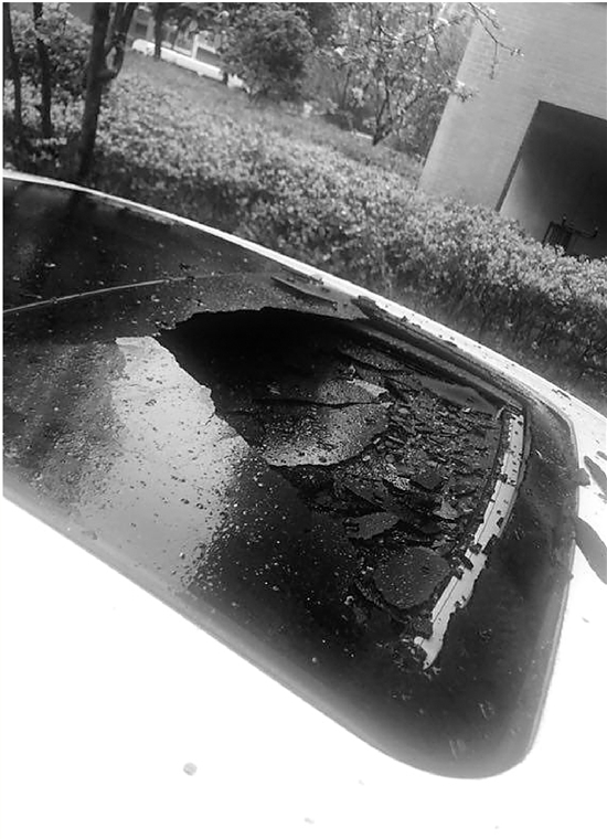 李師傅掏出手機,給錢報記者看了當(dāng)時車子被砸的照片:“你看,這個車子頂部都被砸出一個窟窿。真的是缺德,車頂都被砸穿了!”
