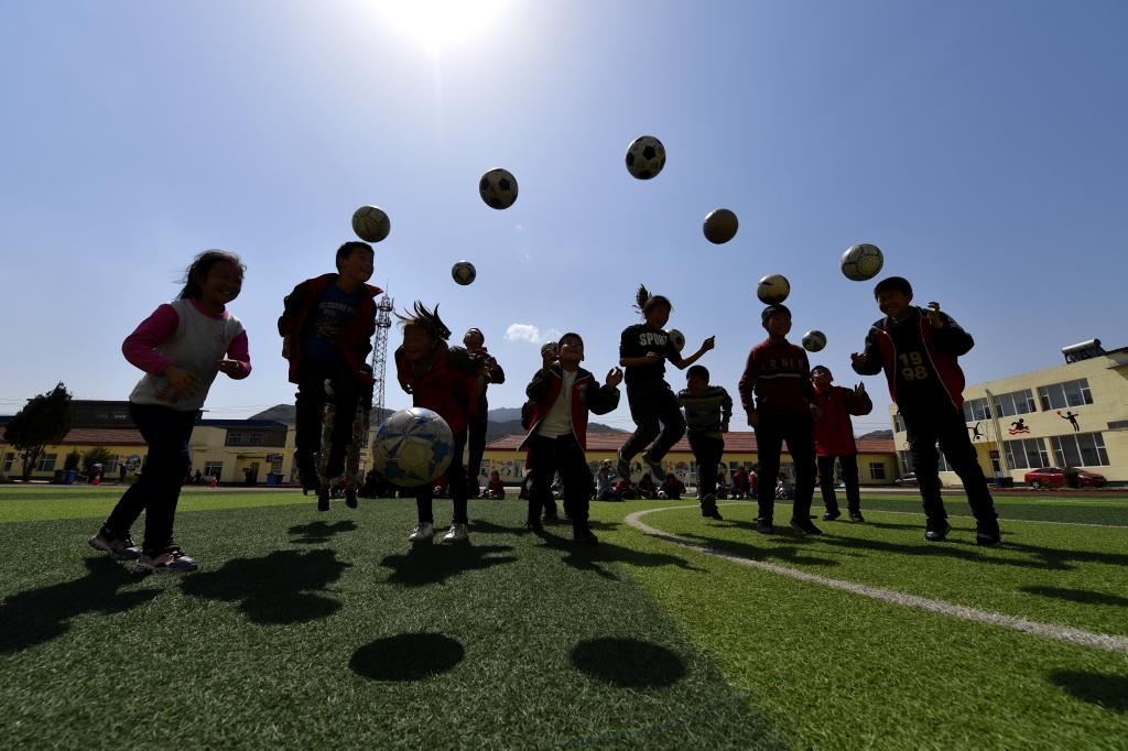 ↑這是學(xué)生們在做足球操(4月16日無人機拍攝)。新華社記者詹彥攝
