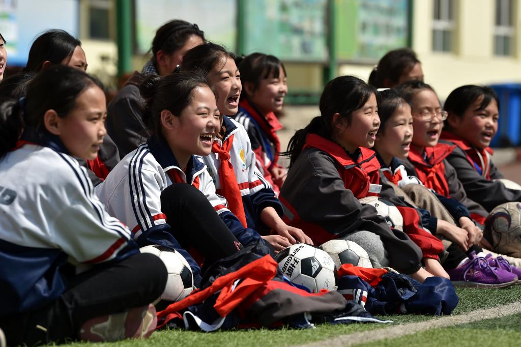 ↑這是初一119班的足球隊隊員在球場上合影(4月16日攝)。新華社記者詹彥攝