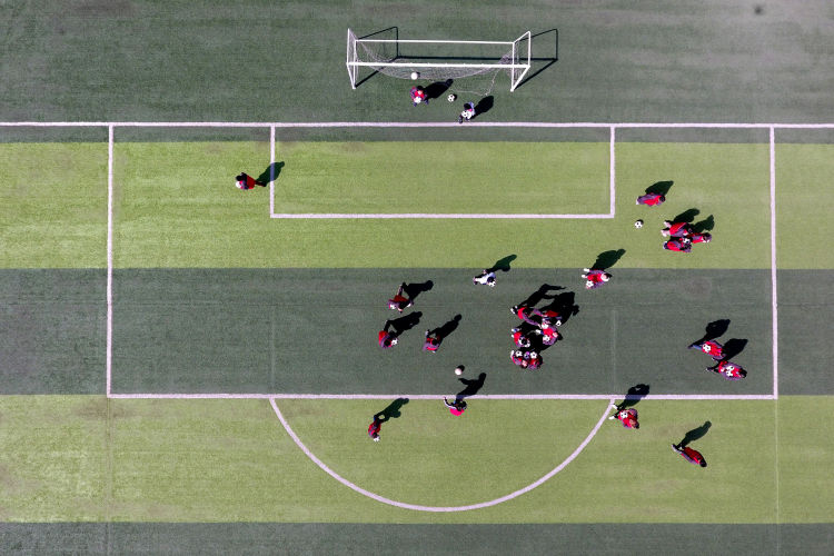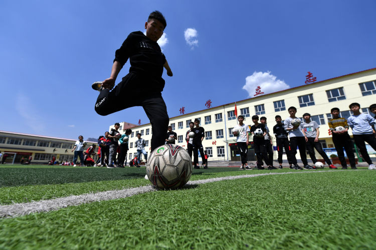 ↑這是初中學(xué)生在足球場上練習(xí)射門(4月16日攝)。新華社記者詹彥攝
