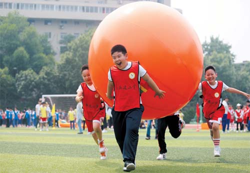 學生在運動會上參加“傳大球接力”比賽