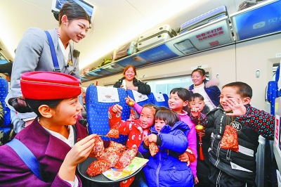 1月24日,在重慶開往福州的G1755次列車上,乘務(wù)員和“小候鳥”做游戲。春運期間,大批務(wù)工人員子女隨長輩踏上與父母團(tuán)聚的旅途,南鐵福州客運段提前對重點線路乘務(wù)組進(jìn)行兒童陪護(hù)培訓(xùn),在列車上準(zhǔn)備了書本和玩具,用愛心護(hù)航“小候鳥”的團(tuán)圓路。新華社記者 宋為偉攝