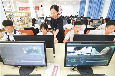 河北省邯鄲市涉縣職業(yè)教育中心數字媒體專業(yè)學生在老師指導下學習影視后期剪輯。郝群英攝(新華社發(fā))