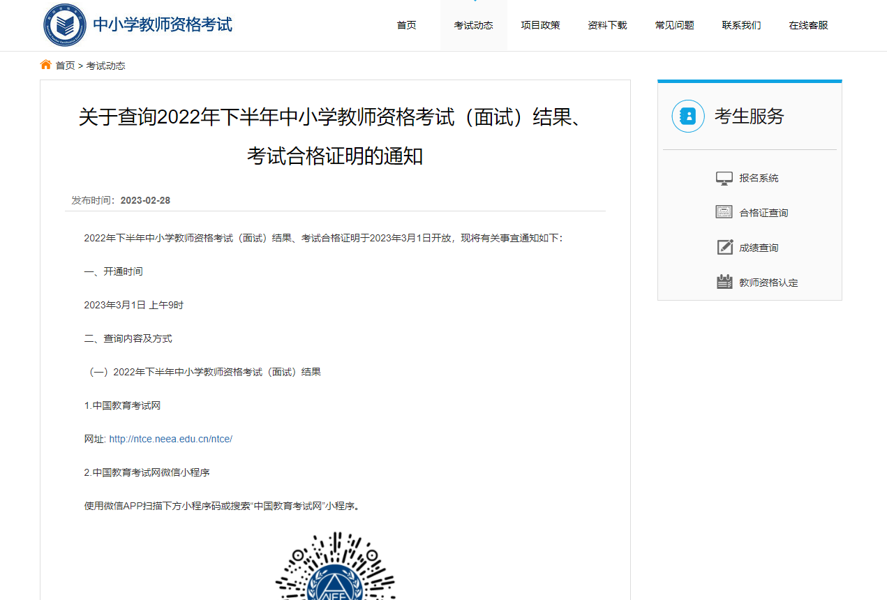 2022年下半年中小學教師資格考試(面試)結(jié)果、考試合格證明于2023年3月1日開放,現(xiàn)將有關(guān)事宜通知如下: