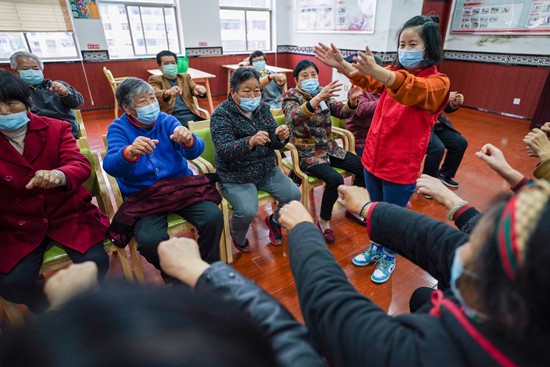 江蘇省鹽城市亭湖區(qū)大洋街道綜合養(yǎng)老服務中心,工作人員在帶領(lǐng)老人練習手指操。新華社記者 李博/攝
