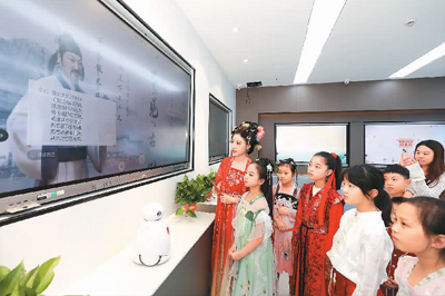 7月19日,在安徽省淮北市圖書館AI智能廳,孩子們正在與“詩仙李白”進(jìn)行互動(dòng)。李 鑫攝(人民視覺)