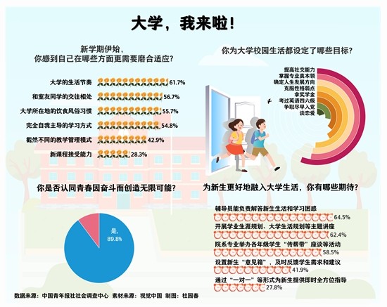 開(kāi)學(xué)季,大一新生陸續(xù)報(bào)到,開(kāi)啟了全新的校園生活。人際交往、學(xué)習(xí)氛圍、生活方式……各方面都需要去探索和適應(yīng)。面對(duì)嶄新的人生階段,他們準(zhǔn)備好了嗎?他們?yōu)樽约旱拇髮W(xué)設(shè)立了什么目標(biāo)?