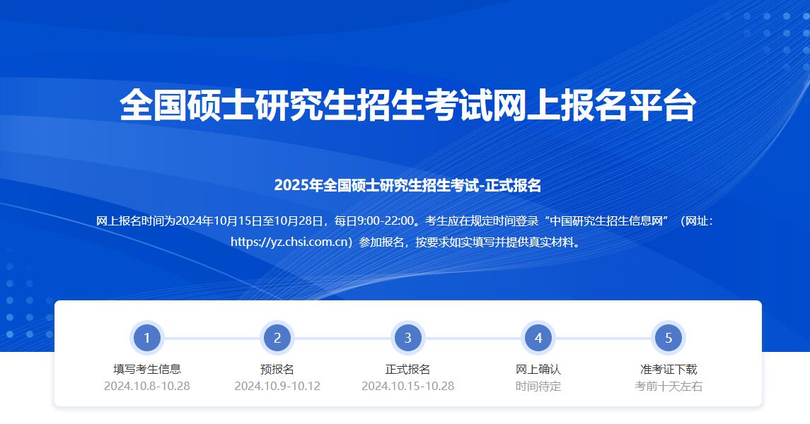 網(wǎng)上報(bào)名時(shí)間為2024年10月15日至10月28日(網(wǎng)上預(yù)報(bào)名時(shí)間為2024年10月9日至10月12日,相關(guān)工作安排由各省級(jí)教育招生考試機(jī)構(gòu)確定并公布),每日9:00-22:00??忌鷳?yīng)在規(guī)定時(shí)間登錄“中國(guó)研究生招生信息網(wǎng)”(網(wǎng)址:https://yz.chsi.com.cn)參加報(bào)名,按要求如實(shí)填寫并提供真實(shí)材料。