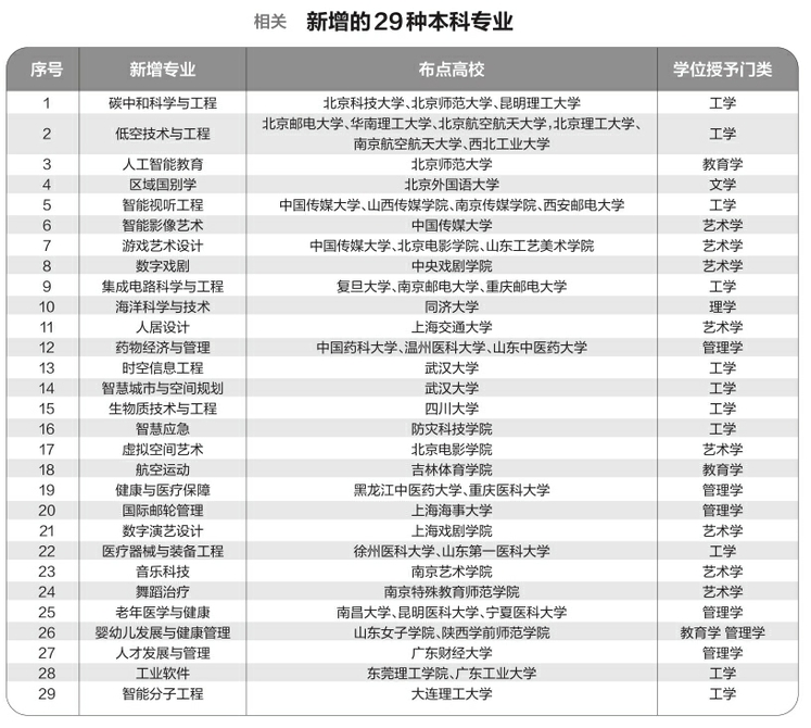 據(jù)悉,此次增設(shè)的29種新專業(yè),充分體現(xiàn)國家戰(zhàn)略、市場需求和科技發(fā)展?fàn)恳?,在服?wù)國家戰(zhàn)略方面,增設(shè)了區(qū)域國別學(xué)、碳中和科學(xué)與工程、海洋科學(xué)與技術(shù)、健康與醫(yī)療保障等專業(yè);面向科技發(fā)展前沿,增設(shè)了智能分子工程、醫(yī)療器械與裝備工程、時(shí)空信息工程等專業(yè);主動(dòng)適應(yīng)市場需求,增設(shè)了國際郵輪管理、航空運(yùn)動(dòng)等專業(yè)。同時(shí),聚焦人工智能賦能經(jīng)濟(jì)社會(huì)發(fā)展,增設(shè)人工智能教育、智能視聽工程、數(shù)字戲劇等專業(yè)。