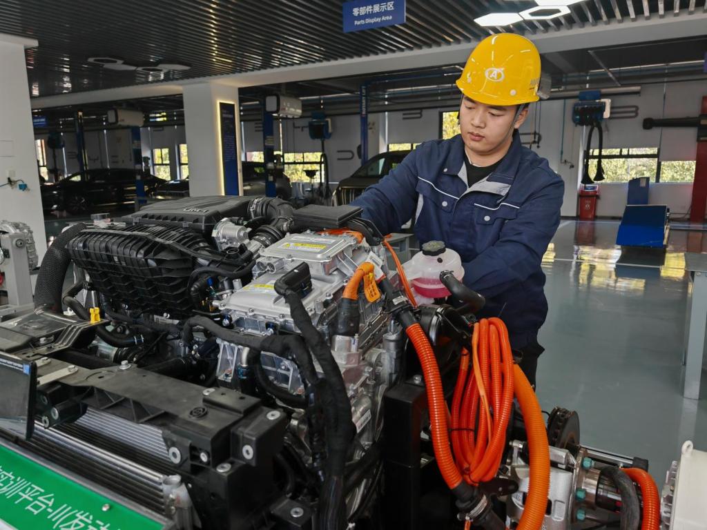 為支撐新能源汽車產(chǎn)業(yè)崛起,河南省全省高職院校開設(shè)相關(guān)專業(yè)點(diǎn)419個(gè),相關(guān)在校生22.14萬人。在河南機(jī)電職業(yè)學(xué)院與比亞迪共建的現(xiàn)場工程師學(xué)院,圍繞“現(xiàn)場工程師”培養(yǎng)開發(fā)了37門項(xiàng)目化課程。該校每年向鄭州航空港區(qū)比亞迪工廠輸送1000余名技能人才,不少學(xué)生迅速成長為產(chǎn)線骨干?!皩W(xué)校通過‘項(xiàng)目+人才’雙交付育人模式,極大地增強(qiáng)了人才培養(yǎng)與企業(yè)需求的匹配度?!北葋喌峡傃b車間主任如是說。