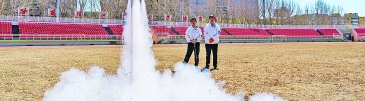 在哈爾濱工業(yè)大學(xué)體育場,航模協(xié)會的學(xué)生操控航模點火發(fā)射。新華社發(fā)