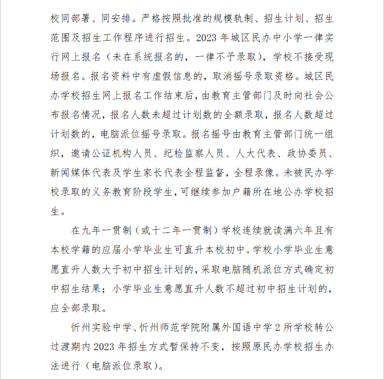 (四)8月8日,忻州市教育局統(tǒng)一組織忻州市北方中學(xué)、忻州現(xiàn)代雙語學(xué)校、忻州市康樂小學(xué)、忻州師范學(xué)院附屬外國(guó)語中學(xué)、忻州實(shí)驗(yàn)中學(xué)五所學(xué)校進(jìn)行搖號(hào),并及時(shí)公布錄取結(jié)果。8月9日至10日,辦理入學(xué)手續(xù)。