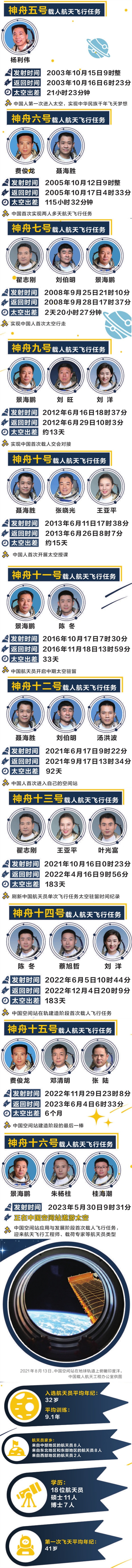 自神舟五號(hào)發(fā)射升空的那刻起,已過去20年的時(shí)光。這20年,見證了中國飛天隊(duì)伍從無到有、發(fā)展壯大的歷程。中國航天員不僅是中國航天輝煌的見證者,更是中國航天夢(mèng)想的踐行者。(中國青年報(bào)記者 張渺 見習(xí)記者 李瑞璇 圖表數(shù)據(jù)整理:邱晨輝 溫維娜 李瑞璇 制圖:程璨)