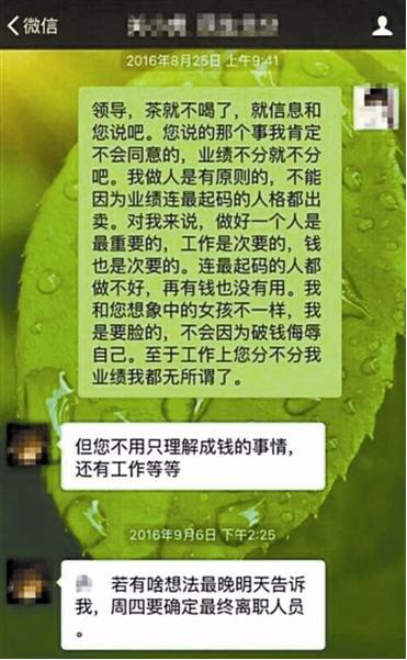 其一,業(yè)績(jī)?yōu)橥?,除了業(yè)績(jī)其他表現(xiàn)都沒(méi)用。據(jù)曝光的微信聊天記錄顯示,關(guān)某某多次提及“業(yè)績(jī)”問(wèn)題。并稱(chēng)“見(jiàn)面聊聊不會(huì)讓你這么為難吧!”