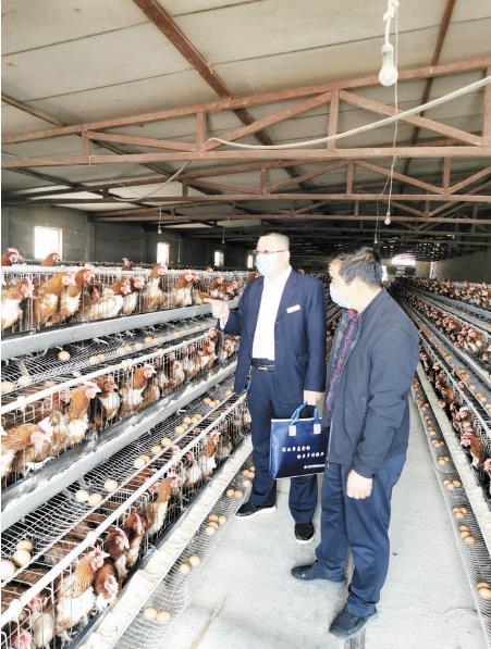 圖為該行員工對(duì)李大叔家的蛋雞生產(chǎn)情況進(jìn)行回訪。