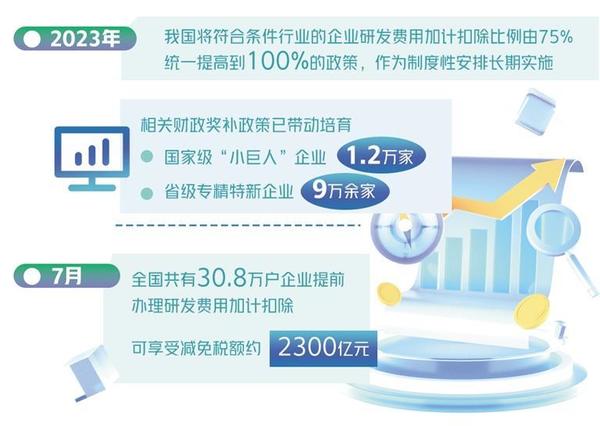 “為切實保證這一新的惠企政策落實到位,稅務(wù)部門依托稅收大數(shù)據(jù)篩選符合條件的企業(yè),定向開展政策精準(zhǔn)推送和宣傳輔導(dǎo),確保企業(yè)‘知曉政策’;會同科技部門及時發(fā)布《研發(fā)費用加計扣除政策執(zhí)行指引2.0》,細(xì)化政策口徑,確保企業(yè)‘會用政策’;第一時間優(yōu)化升級征管系統(tǒng),改進(jìn)電子稅務(wù)局功能,讓納稅人‘足不出戶’即可快捷辦理,確保企業(yè)‘用好政策’?!眹叶悇?wù)總局新聞發(fā)言人、辦公廳主任黃運介紹。從7月份政策落實情況看,全國共有30.8萬戶企業(yè)提前辦理研發(fā)費用加計扣除,可享受減免稅額約2300億元。