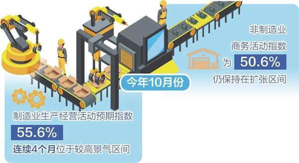 從市場(chǎng)預(yù)期看,10月份,制造業(yè)生產(chǎn)經(jīng)營(yíng)活動(dòng)預(yù)期指數(shù)為55.6%,比上月上升0.1個(gè)百分點(diǎn),連續(xù)4個(gè)月位于較高景氣區(qū)間,制造業(yè)企業(yè)對(duì)市場(chǎng)發(fā)展信心穩(wěn)定。