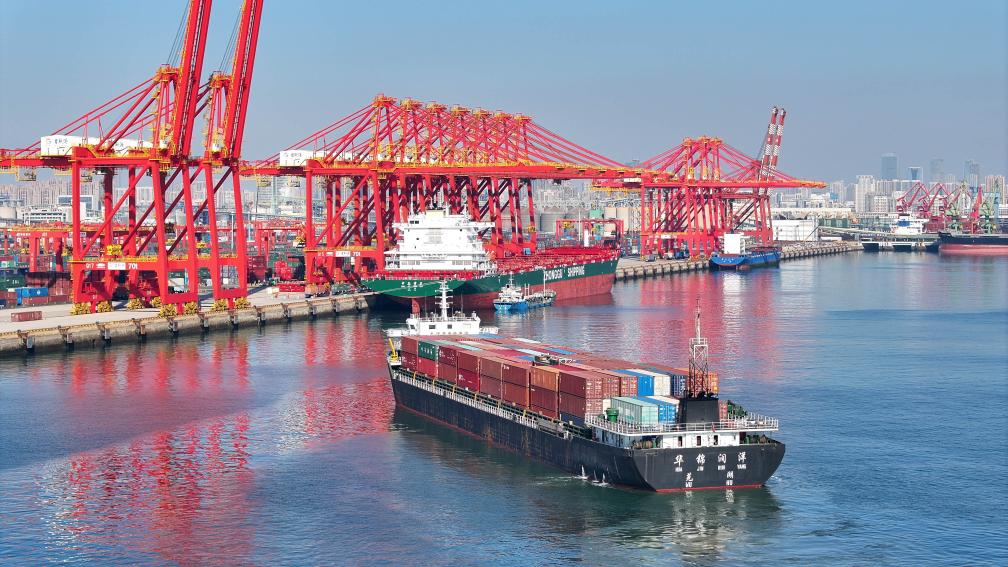 在山東港口日照港,貨輪停泊集裝箱碼頭裝卸作業(yè)(1月10日攝,無人機(jī)照片)。新華社記者 郭緒雷 攝