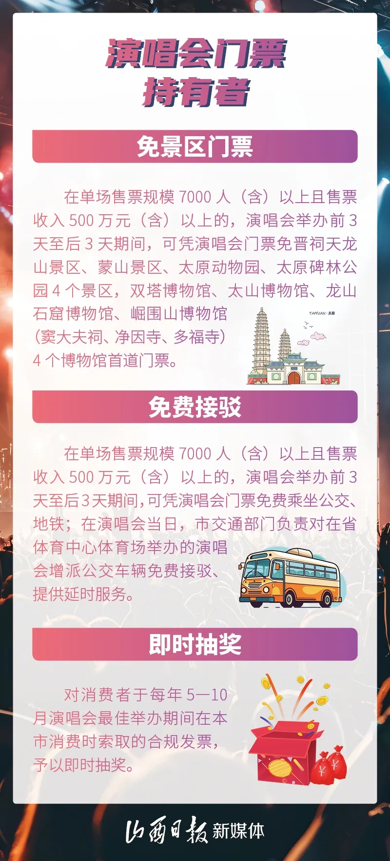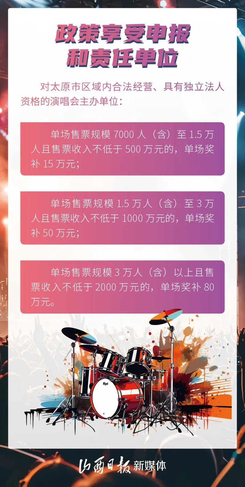 為做大太原市演唱會經(jīng)濟,加快建設(shè)華北地區(qū)重要演藝中心,打造“國內(nèi)外重要文化旅游目的地”,日前,太原市發(fā)展和改革委、市文化和旅游局、市財政局等11個部門聯(lián)合制定出臺《支持演唱會經(jīng)濟發(fā)展的若干措施(試行)》。
