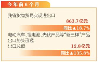 本報訊(記者孟婷)7月31日,記者從太原海關(guān)獲悉,據(jù)統(tǒng)計,今年前6個月,我省貨物貿(mào)易實現(xiàn)進出口863.7億元,同比增長18.7%,與此同時,電動汽車、鋰電池、光伏產(chǎn)品等“新三樣”產(chǎn)品出口勢頭迅猛,出口總額12.8億元,同比增長135.8%,遠超傳統(tǒng)出口商品。這些高科技產(chǎn)品不僅代表山西制造業(yè)轉(zhuǎn)型升級的最新成果,也為山西在國際市場競爭中贏得了新優(yōu)勢。