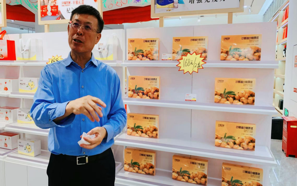 國家林業(yè)重點(diǎn)龍頭企業(yè)寧夏沃福百瑞公司產(chǎn)品間展示柜上擺放的沙棘油、沙棘原漿。新華網(wǎng)郭香玉攝
