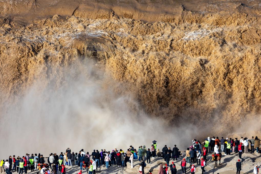 游客在山西省臨汾市吉縣黃河壺口瀑布景區(qū)游覽觀瀑(10月1日攝)。新華社發(fā)(劉宏達攝)