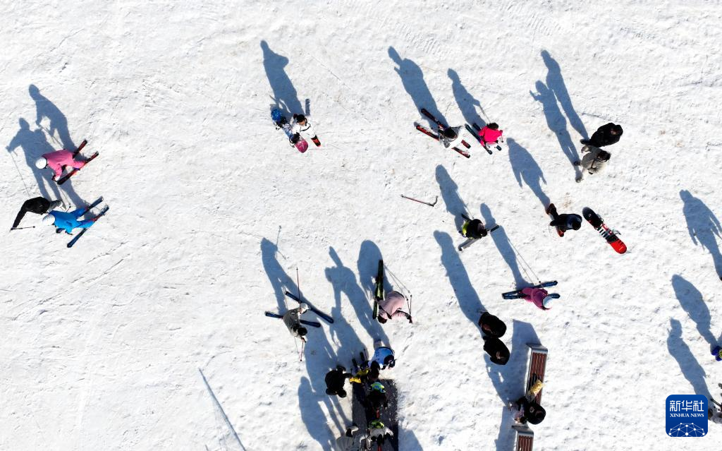 1月19日,游客在邯鄲市復興區(qū)東高河村滑雪場內滑雪游玩(無人機照片)。