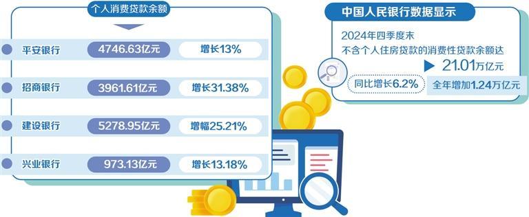 2024年,上市銀行零售業(yè)務普遍進入調整期,消費貸業(yè)務增長強勁。在擴內需、促消費的背景下,消費貸成為零售業(yè)務的新增長點。中國人民銀行數據顯示,2024年四季度末,不含個人住房貸款的消費性貸款余額達21.01萬億元,同比增長6.2%,全年增加1.24萬億元。多家銀行在2024年年報中披露的個人消費貸款數據有明顯增長。其中,平安銀行個人消費貸款余額4746.63億元,同比增長13%;招商銀行個人消費貸款余額3961.61億元,較上年末增長31.38%;中國農業(yè)銀行含信用卡在內的個人消費貸款余額1.3萬億元,新增2943億元,增速28.3%;中國建設銀行境內個人消費貸款余額5278.95億元,增幅25.21%;興業(yè)銀行個人消費貸款余額973.13億元,較上年末增長13.18%。南開大學金融學教授田利輝表示,隨著國家提振消費政策的出臺,銀行零售業(yè)務有望逐步提速。消費貸業(yè)務有望在政策支持下繼續(xù)增長,成為銀行重要的利潤來源。