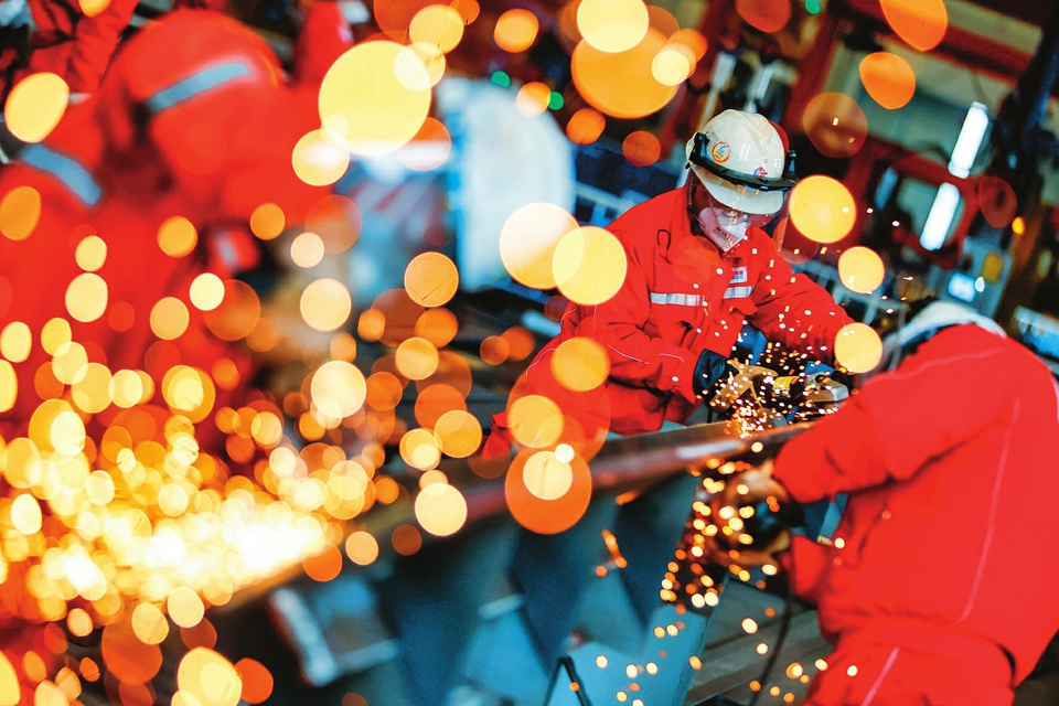 1月19日,在天津市濱海新區(qū),海上油氣平臺建設工人進行打磨作業(yè)。