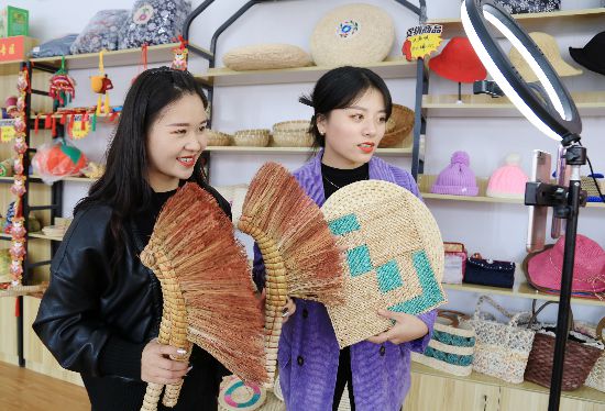 10月11日,甘肅隴南市西和縣消費扶貧直銷店,供銷社工作人員正在直播帶貨拓展“線上”農(nóng)產(chǎn)品銷售。李旭春攝(人民視覺)