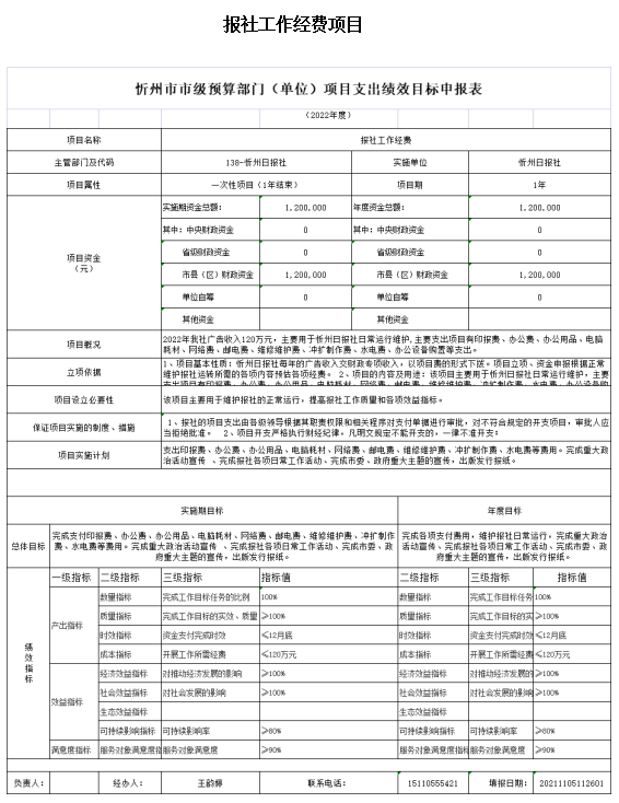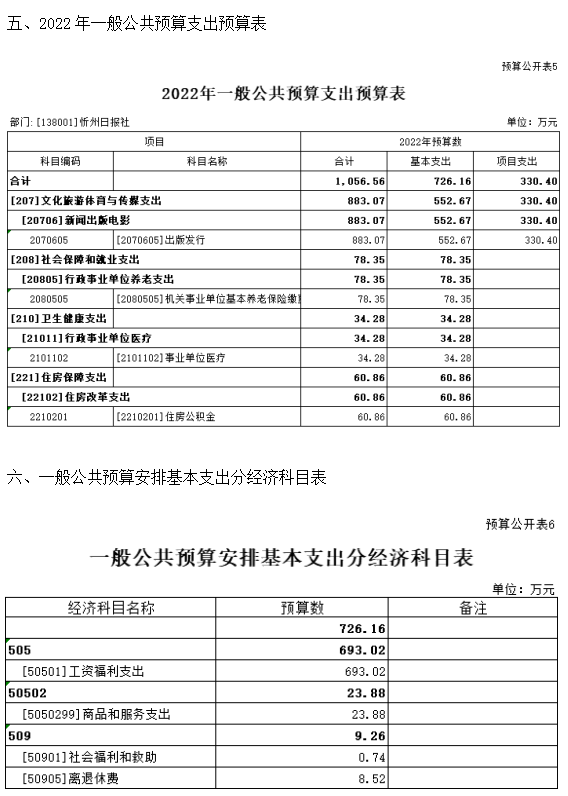 第三部分 2022年度部門預算情況說明 一、2022年度部門預算數(shù)據(jù)變動情況及原因 1、收入預算說明 忻州日報社2022年收入預算1056.56萬元,比2021年增加176.61萬元。 2、支出預算說明 基本支出726.16萬元,比2021年減少33.79萬元,基本支出系按現(xiàn)有人員工資標準和公共經(jīng)費定額標準核定,主要用于保障機關正常運轉(zhuǎn)、完成日常工作任務而發(fā)生的各項支出。其中:工資福利支出693.02萬元,對個人和家庭的補助支出9.26萬元,公用經(jīng)費項目23.88萬元。 項目支出330.4萬元,比2021年增加210.4萬元。主要為廣告收入專項經(jīng)費120萬元,主要用于辦公費、維修費、水電費、差旅費、采暖費、郵電費等日常開支。第一書記和駐村工作隊補助5.4萬元,主要用于下鄉(xiāng)工作隊補助費用。資產(chǎn)購置205萬元,主要用于購買報社印報所需的專用設備。 我單位不涉及政府性基金預算,2022年度政府性基金預算財政撥款本年收入0元,本年支出0元。 二、“三公”經(jīng)費增減變動原因說明 我單位是全額事業(yè)單位,財政只撥付人員經(jīng)費。從財政撥款中沒有支出“三公經(jīng)費”,“三公經(jīng)費”數(shù)字為0,故有關“三公經(jīng)費”的內(nèi)容均無。一般公共預算“三公”經(jīng)費支出表、“三公”經(jīng)費增減變化原因及因公出國、公務用車、公務接待等項均無數(shù)字。也沒有因公出國(境)團組數(shù)及人數(shù),“公務用車購置和運行費”為0。 三、機關運行經(jīng)費增減變動原因說明 本部門機關運行經(jīng)費未使用財政撥款,全部由部門自有資金支付。 四、政府采購情況 2022年我單位政府采購預算總額246萬元,其中:政府采購貨物預算246萬元、政府采購工程預算0萬元、政府采購服務預算0萬元。 五、績效管理情況 1、績效管理情況 2022年忻州日報社實行績效目標管理的項目3個,涉及一般公共預算當年撥款330.4萬元。 2、績效目標情況