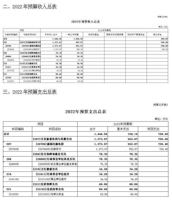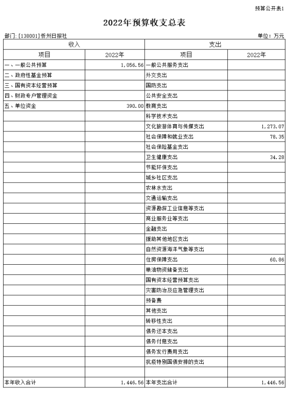 目 錄 第一部分概況 一、忻州日報社職責......................................3 二、機構設置情況........................................3 第二部分2022年度忻州日報社預算報表 一、預算收支總表........................................5 二、預算收入總表........................................6 三、預算支出總表........................................6 四、財政撥款收支總表....................................7 五、一般公共預算支出預算表..............................8 六、一般公共預算安排基本支出分經(jīng)濟科目表................8 七、政府性基金預算收入預算表............................9 八、政府性基金預算支出預算表............................9 九、國有資本經(jīng)營預算收支預算表..........................9 十、“三公”經(jīng)費支出預算表..............................10 十一、機關運行經(jīng)費預算財政撥款情況表....................10 第三部分2022年度忻州日報社預算情況說明 一、2022年度部門預算數(shù)據(jù)變動情況及原因..................11 二、“三公”經(jīng)費增減變動原因說明.........................12 三、機關運行經(jīng)費增減變動原因說明........................12 四、政府采購情況........................................12 五、績效管理情況........................................12 六、國有資產(chǎn)占有使用情況................................15 七、其他說明...........................................15 第四部分 名詞解釋...........................................16 第一部分 概況 一、忻州日報社職責 1、堅持政治家辦報的方針,把握正確的輿論導向,圍繞中心,服務大局,著力營造推進轉(zhuǎn)型跨越發(fā)展的輿論氛圍。 2、服從服務于市委、市政府中心工作,加強輿論宣傳和引導,發(fā)揮主流媒體作用,為開放造勢,為發(fā)展鼓勁,為人民盡責。 3、堅持從群眾中來,到群眾中去,圍繞“貼近實際、貼近群眾、貼近生活”,反映群眾的疾苦和呼聲,傾聽群眾的意見和建議,一切以為人民服務為出發(fā)點和落腳點。 4、堅持正面宣傳報道為主,積極開展輿論監(jiān)督。 5、承辦市委、市政府和市委宣傳部交辦的其他事項。 二、機構設置情況 1、基本情況:忻州日報社是市委直屬的全額事業(yè)單位,正處級建制。忻州日報社全額事業(yè)單位編制66名。其中,領導職數(shù)4人,社長1名(正處),總編輯1名(正處),副社長1名(副處),副總編輯1名(副處)。我社主要負責忻州日報的出版發(fā)行及忻州在線等新媒體平臺的發(fā)布運營。 2、部門預算單位構成:忻州日報社是一級預算單位,無下屬單位。部門預算只有一個單位,即忻州日報社。 第二部分 2022年度部門預算報表 一、2022年預算收支總表
